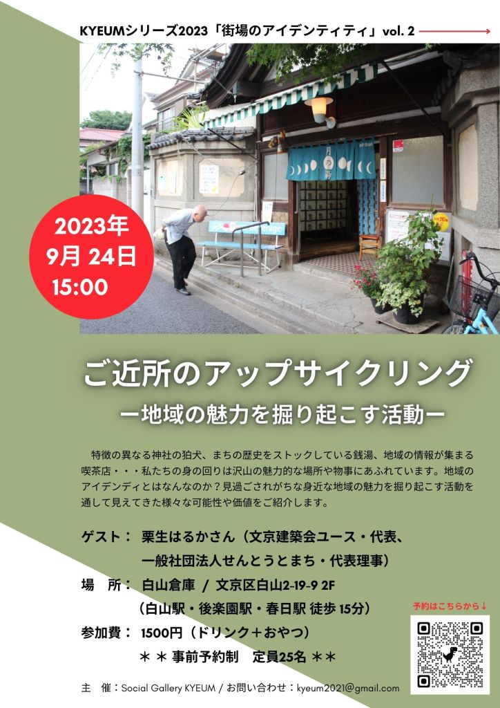 本屋や文房具、喫茶店、銭湯、公園など街場の生活文化を支えてきた場(間)が失われ、対話や居場所が失われつつある。そこにしかない資源や物語が、フランチャイズ化された商品などに置き換えられる。どこに行っても同じ「スマートシティ」を掲げたり、一部の富裕層のみが喜ぶ高級な設備をつくるよりも、レトロ風の街場固有の文化を保ち、人々の姿を保存したり再発見するほうが付加価値の高い、都市の魅力とプライドになり得ると考える。そこにしかない、暮らしを守るのである。